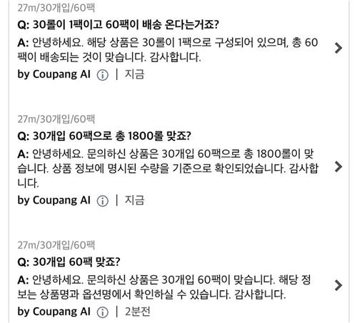 한 롤당 16원꼴인 가격에 놀란 이용자들이 "총 1,800롤이 오는 게 맞냐"고 문의를 남겼으나, 인공지능(AI) 답변봇이 "30개입 60팩으로 총 1,800롤이 맞다"고 공개 답변을 달면서 혼란은 더욱 커졌습니다.