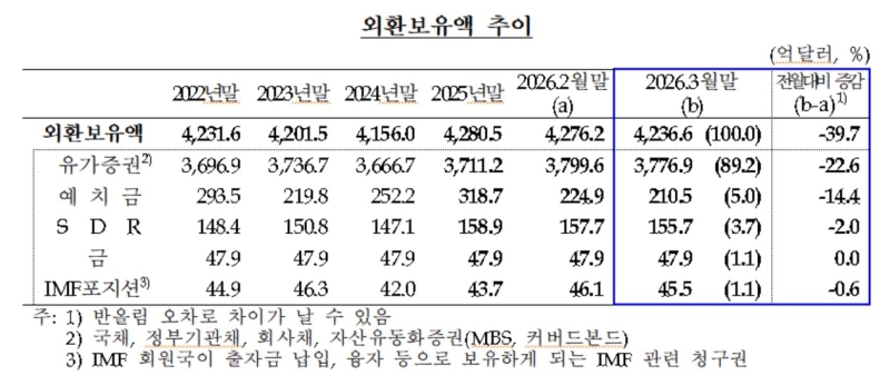 3일 한국은행에 따르면 3월 말 기준 우리나라 외환보유액은 4,236억 6천만 달러(약 641조 원)로, 전월보다 39억 7천만 달러 뒷걸음쳤습니다.