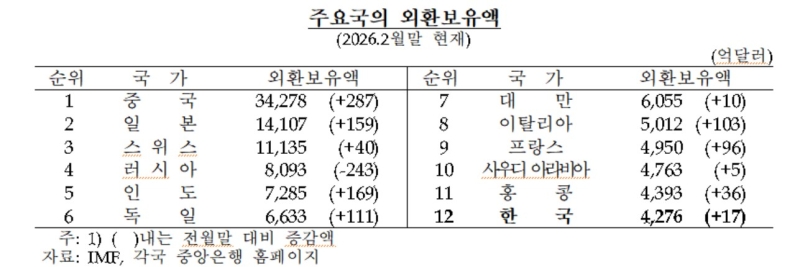 한은 관계자는 "3월 달러 강세로 기타 통화 외화자산의 달러화 환산액이 줄어든 데다, 국민연금과 외환 스와프 등 외환시장 안정화 조치도 실행되면서 외환보유액이 줄었다"고 설명했습니다.