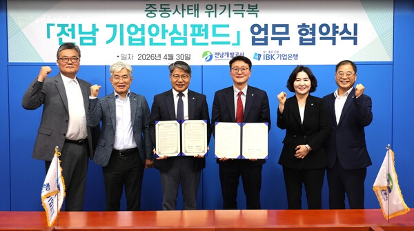 전남개발공사는 30일 IBK기업은행과 '중동위기극복 전남 기업안심펀드' 업무협약을 맺고 공사가 조성한 예탁금 15억 원을 재원으로 전남 소재 중소기업에게 연 1.76%의 감면금리를 지원하는 펀드를 5월부터 운영하기로 했습니다.
