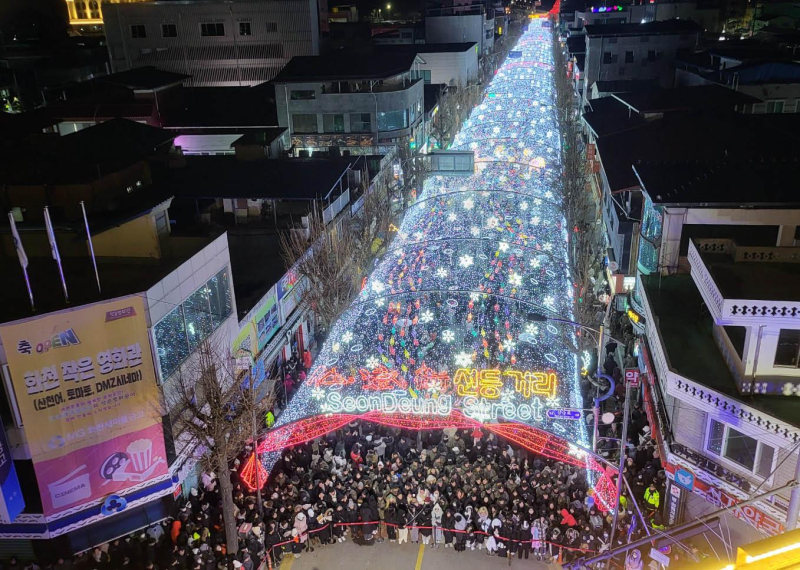 화천군은 해마다 축제 개막을 2주 앞두고 선등거리에 형형색색의 등(燈)과 LED 조명 수만 개를 매달아 축제가 끝날 때까지 불을 밝히고 있습니다.