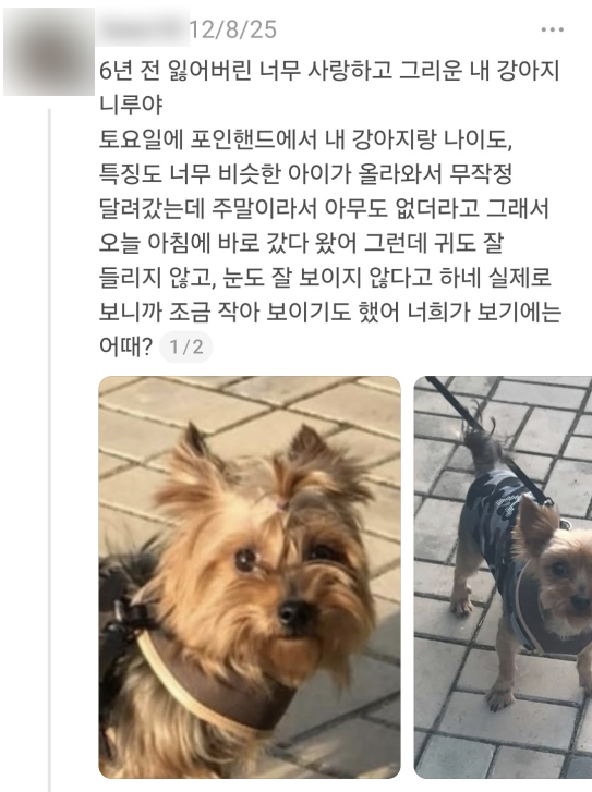 6년 전 실종된 반려견 '니루'를 잊지 못해 꾸준히 소식을 찾아왔던 문 씨는 사진 속 강아지에게서 익숙한 무언가를 느꼈습니다.