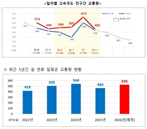 이에 따라 고속도로 일평균 통행량은 작년보다 14.1% 증가한 525만 대로 관측됐습니다. 설 당일에는 성묘객 등이 몰리며 작년보다 11% 늘어난 615만 대가 고속도로에 쏟아져 나올 것으로 예상됐습니다.