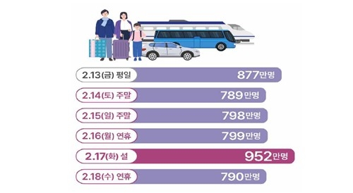 연휴 기간 짧아 지난해보다 13% 감소...설 당일 952만 명 몰려