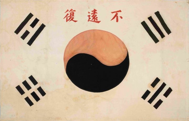 태극 문양 위에 붉은 글씨로 머지않아 국권을 회복한다는 '不遠復'이란 글귀를 뚜렷하게 수놓았습니다.