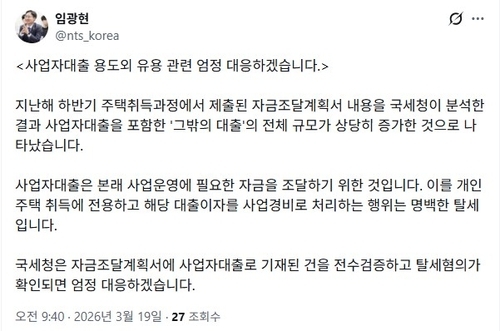 임광현 국세청장은 19일 소셜미디어 'X'(구 트위터)에 "사업자 대출 용도 외 유용과 관련해 엄정하게 대응하겠다"고 밝혔습니다.