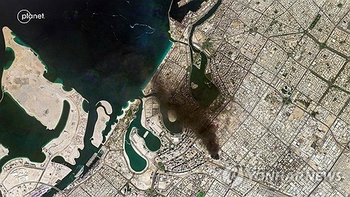 ▲이란 공격에 연기 휩싸인 두바이 모습 담은 플래닛랩스 위성사진[연합뉴스]