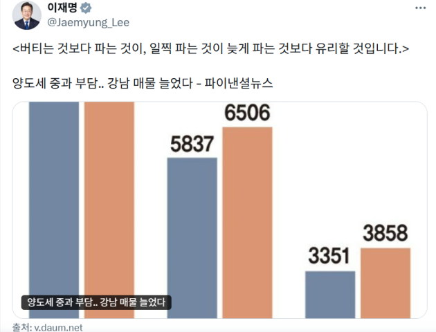 연이어 추가 메시지를 통해 "버티는 것보다 파는 것이, 일찍 파는 것이 늦게 파는 것보다 유리할 것입니다"라며 양도세 중과 부담으로 강남 매물 늘었다는 기사를 공유했습니다.