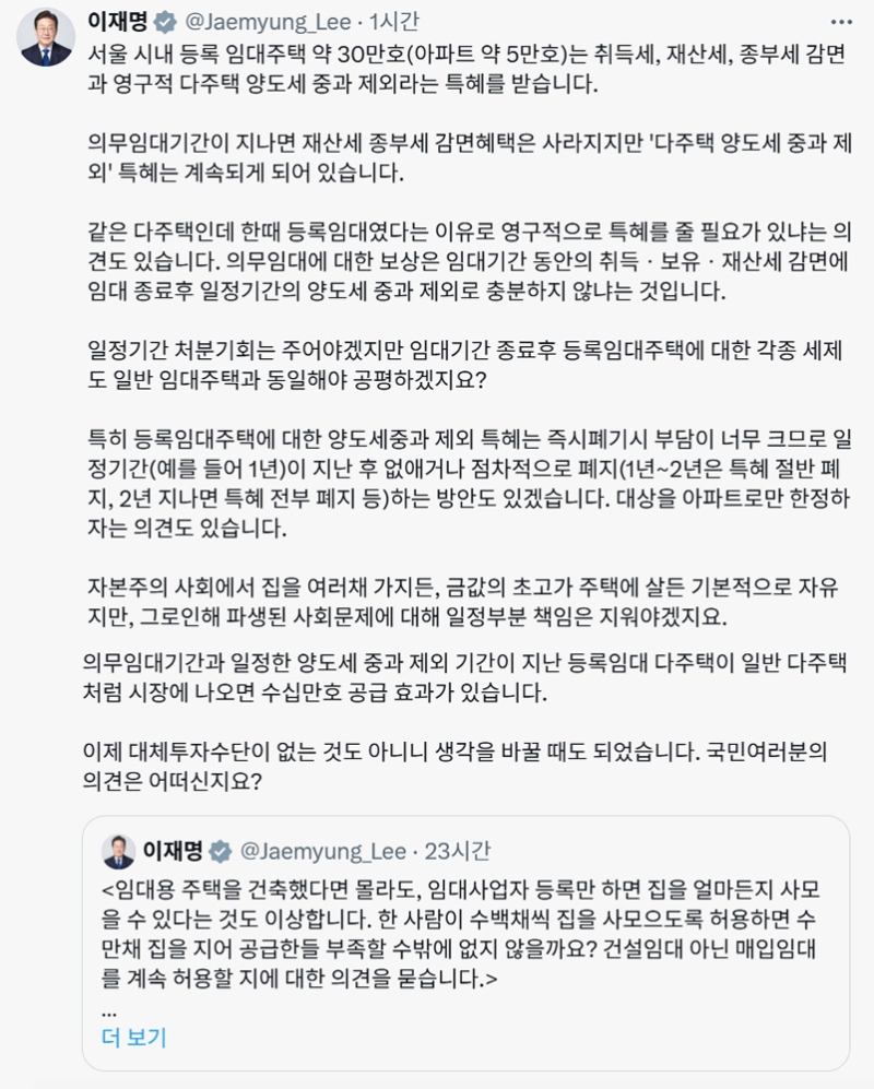 이 대통령은 9일 오후 엑스(X, 구 트위터)에 "서울 시내 등록 임대주택 약 30만 호(아파트 약 5만 호)는 취득세, 재산세, 종부세 감면과 영구적 다주택 양도세 중과 제외라는 특혜를 받는다"고 밝혔습니다.