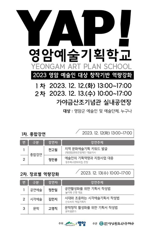 영암문화관광재단 지역문화사업팀은 12일, 13일 가야금산조기념관 실내 공연장에서 예술인과 입문자를 위한‘영암 예술 기획 학교 YAP!(YEONGAM-ART-PLAN)’을 운영합니다.