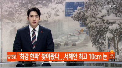 1. '최강 한파' 찾아왔다...서해안 최고 10cm 눈 2. '4년 20조 지원'..."항구적 지원 근거 필요" 3. '2차 공공기관 우선 지원' 농·수협 등 기대감 4. 순천 간부 공무원 택시기사 폭행·차량 탈취 5. 광주대표도서관 유가족 '재발 방지 대책' 요구