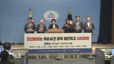 더불어민주당 전남 국회의원들이 조선일보가 여순사건을 왜곡 보도했다며 공식 사과를 요구했습니다. 전남지역 국회의원 10명은 국회에서 기자회견을 열고 "조선일보가 여순사건 77주기 대통령 추모 메시지를 '남로당 반란 옹호'로 왜곡했다"며 "희생자와 유족의 명예를 짓밟은 반역사적 행태"라고 비판했습니다. 의원들은 "대통령의 추모 메시지는 국민통합의 뜻을 담은 것인데 이를 '반국가적 역사관'으로 몰아간 것은 언론의 폭력"이라고 주장하고, 희생자와 유족에게 사죄를 촉구했습니다.