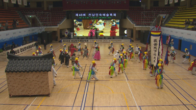 남도문화제로 출발해 48회째를 맞은 전남민속예술축제가 강진 제1실내체육관에서 열렸습니다. 이번 전남민속예술축제엔 각 시군을 대표해 일반부 17개 팀, 청소년부 9개 팀 등 총 26팀 900여 명이 참가해 오는 29일까지 농악과 민요, 민속놀이 등 전통민속예술 경연을 펼칩니다. 일반부와 청소년부 대상 수상팀은 내년에 문화관광체육부가 주최하는 한국민속예술축제에 전남 대표로 참가할 자격이 주어집니다.