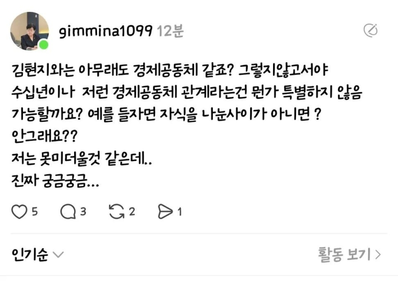 게시글에는 "김현지와는 아무래도 경제공동체 같죠? 그렇지 않고서야 수십 년이나 저런 경제공동체 관계라는 건 뭔가 특별하지 않음 가능할까요? 예를 들자면 자식을 나눈 사이가 아니면?"이라는 내용이 담겼습니다.