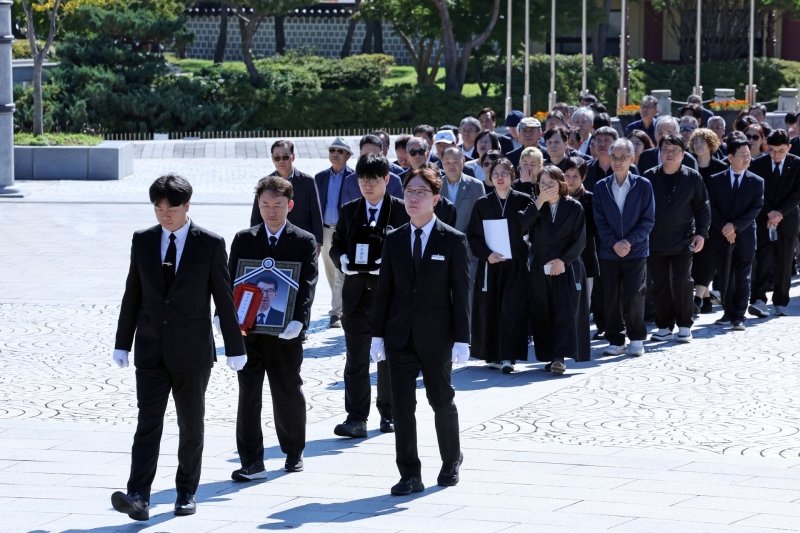 ▲11일 오전 광주 북구 운정동 국립5·18민주묘지에서 열린 5·18 시민군 출신 정해직 씨의 민주장 영결식에서 참석자들이 추모탑으로 이동하고 있다. [연합뉴스]