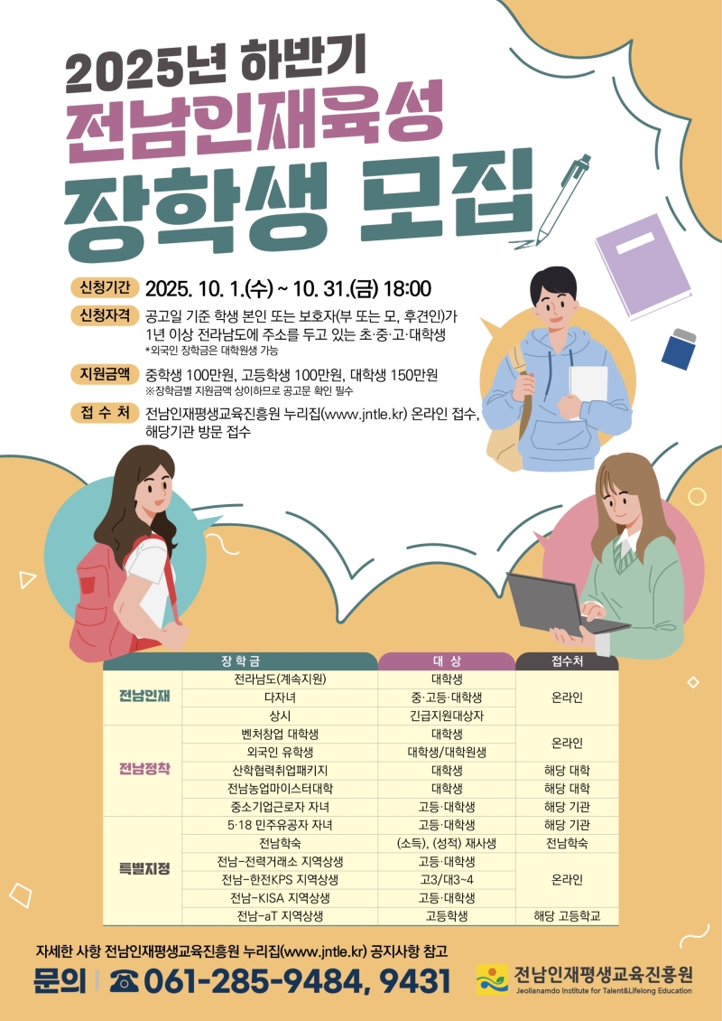 전라남도와 전남인재평생교육진흥원이 2025년 하반기 전남인재육성 장학생을 모집합니다.