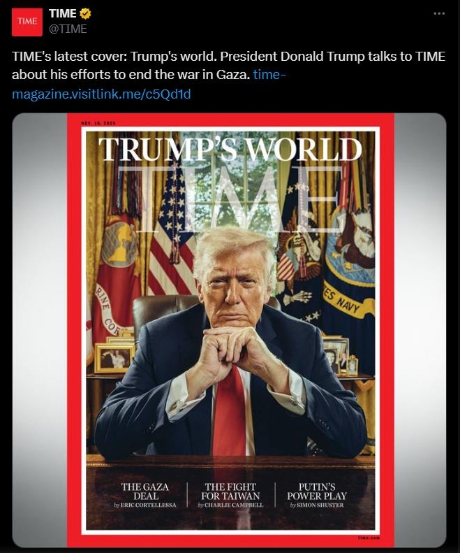 앞서 영국 일간 가디언은 지난 15일 트럼프 대통령이 자신의 가자 휴전 협정 중재 업적을 극찬한 기사 내용에도 불구하고 사진 촬영 각도가 맘에 들지 않는다며 타임에 공개적인 불만을 드러냈다고 보도했습니다.
