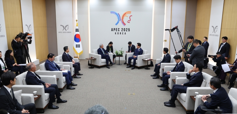 ▲ 이재명 대통령이 31일 APEC 정상회의장인 경주화백컨벤션센터에서 젠슨 황 엔비디아 최고경영자를 접견하고 있다 [연합뉴스]