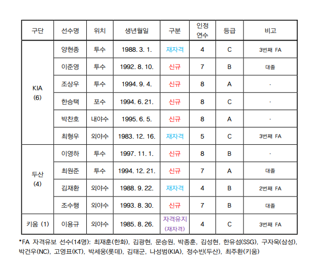 이 중 생애 첫 FA 자격을 얻은 선수가 13명, 재자격 선수는 11명, 이미 FA 자격을 취득했지만 FA 승인 신청을 하지 않고 자격을 유지한 선수는 6명입니다.
