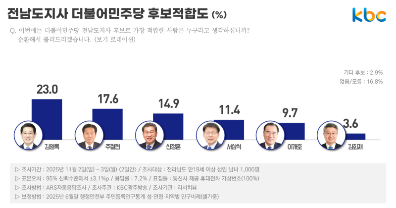 더불어민주당 후보만을 대상으로 적합도를 물은 결과 △김영록 현 전라남도지사(23.0%) △주철현 전 민주당 전남도당위원장(17.6%) △신정훈 현 국회 행정안전위원장(14.9%) △서삼석 현 민주당 최고위원(11.4%) △이개호 전 농림축산식품부 장관(9.7%) △김회재 전 국회의원(3.6%) 순으로 조사됐습니다.