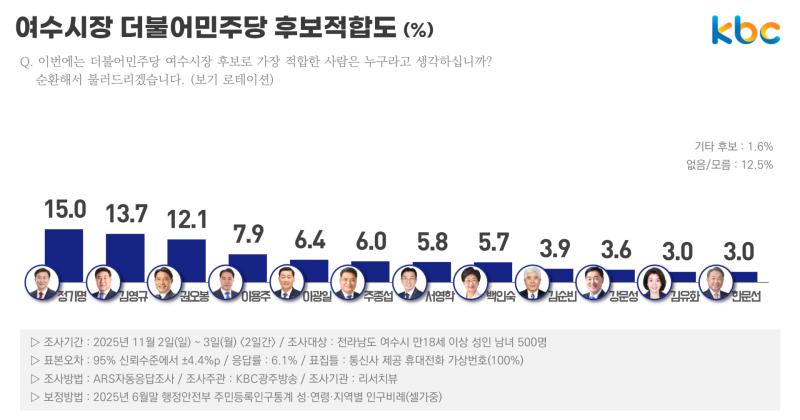 △이광일 전남도의회 부의장 6.8% △명창환 전 전남도 행정부지사 6.2% △주종섭 전남도의원 6.1% △이용주 전 국회의원 5.8% △서영학 기본사회 여수본부 상임대표 5.2% △백인숙 여수시의회 의장 5.1% △이상우 조국혁신당 여수시 지역위원장 3.7% △한문선 여수상의 회장 3.6% △김순빈 전 여수시의회 부의장 3.1% △박정숙 국민의힘 여수시당협위원장 3.1% △강문성 전남도의원 2.5% △김창주 전 여수경영인협회 회장 2.4% △김유화 전 여수시도시관리공단 이사장 2.0% 등이었습니다.