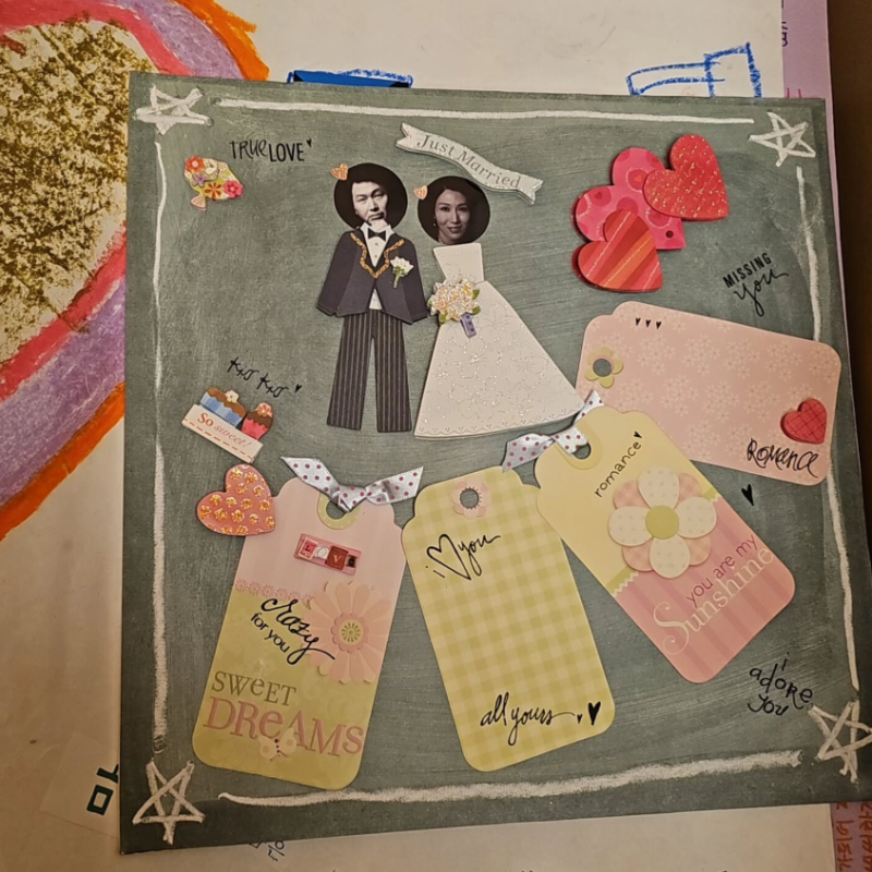 도화지에는 최태원 SK그룹 회장과 노 관장의 얼굴 사진 위에 종이로 만든 턱시도와 드레스가 붙어 있습니다.