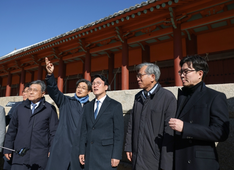 ▲ 10일 서울시의 종묘 앞 고층건물 허용과 관련하여 종묘를 방문해 외부 조망을 점검 중인 김민석 국무총리(가운데) [연합뉴스]