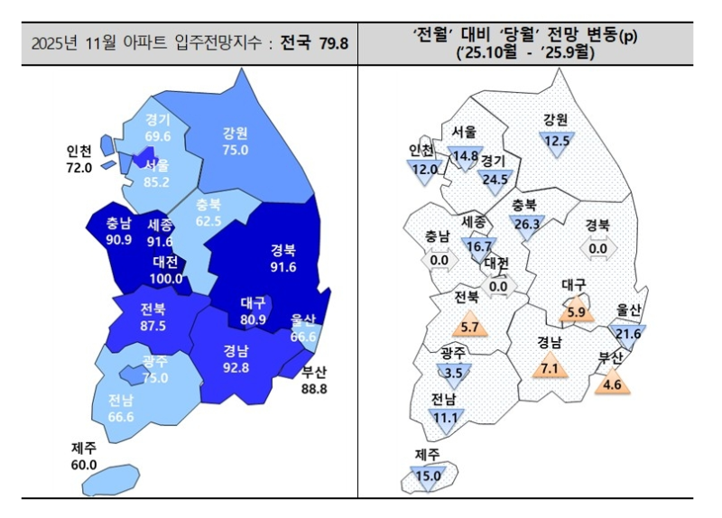 주택산업연구원이 주택 사업자를 대상으로 설문 조사한 결과, 11월 전국 아파트 입주 전망지수는 79.8로, 전달(87.7) 대비 7.9p 하락한 것으로 조사됐습니다.