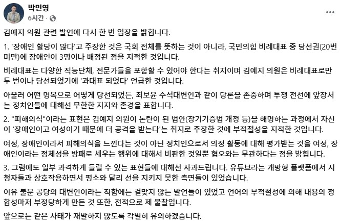 지난 12일 박민영 대변인은 한 유튜브 방송에서 비례대표 재선이자 시각장애인인 김예지 의원에 대한 공천이 부당하다며 "장애인 할당이 너무 많다", "눈이 불편한 것을 제외하면 기득권", "배려를 당연히 여긴다" 등의 발언을 했습니다.