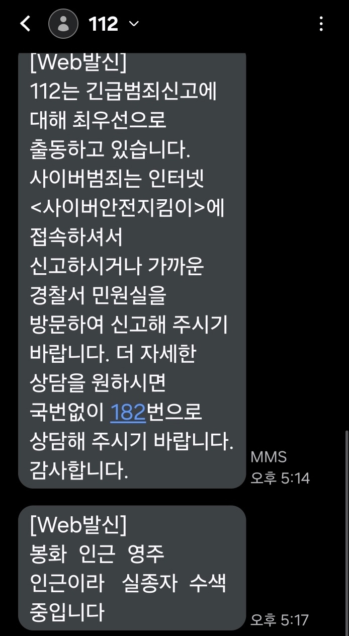 실제로 마을 주민이 A씨 도주 당시 발신 번호 '112'로부터 받은 문자메시지에는 '봉화 인근 영주 인근이라 실종자 수색 중입니다'라는 내용이 담겼습니다.