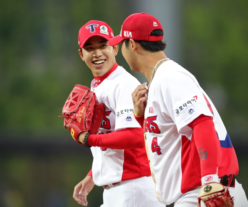 ▲ 2017년, 이닝을 마친 뒤 팀 동료와 덕아웃에 향하며 미소 짓는 임기영 [KIA타이거즈]
