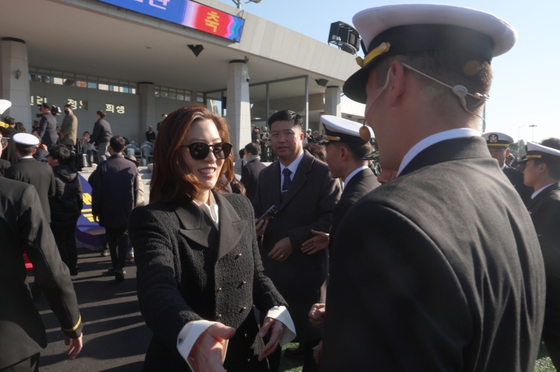 ▲임세령 대상홀딩스 부회장이 28일 오후 경남 창원시 진해구 해군사관학교 연병장에서 열린 제139기 해군·해병대 사관후보생 수료 및 임관식에서 아들인 이지호 신임 소위를 격려하고 있다 [연합뉴스]
