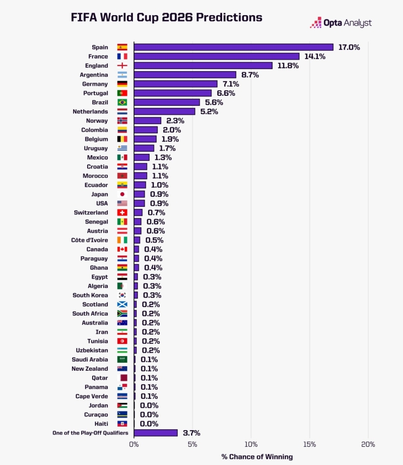 옵타 슈퍼컴퓨터가 본선 진출을 확정한 42개국에서 가장 높은 우승 확률로 손꼽은 국가는 17%의 스페인이었습니다.