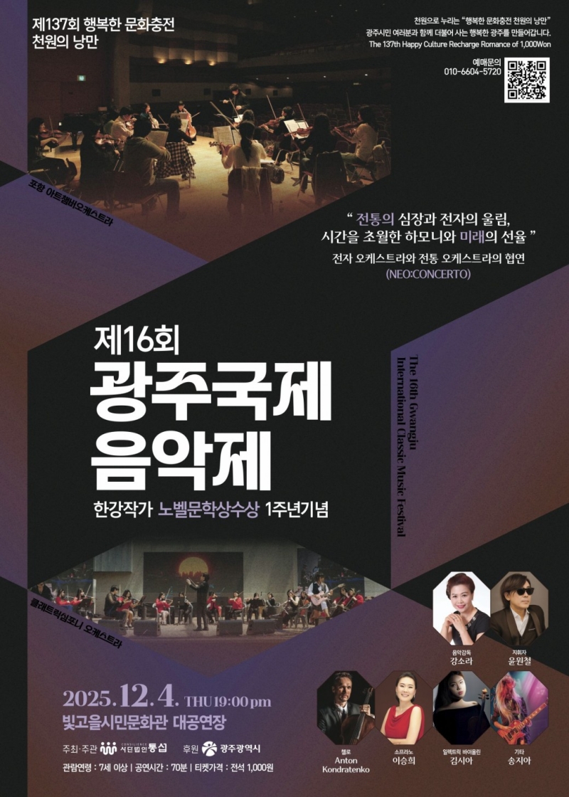 사단법인 통섭이 주최·주관하는 제16회 광주국제음악제가 한강 작가의 노벨문학상 수상 1주년을 기념해 12월 4일 오후 7시, 빛고을시민문화회관 대극장에서 특별 공연 '전통의 심장과 전자의 울림(NEO:CONCERTO)'을 개최합니다.