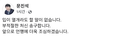 문 수석은 이날 페이스북을 통해 "부적절한 처신 송구하다"며 이같이 말했습니다.