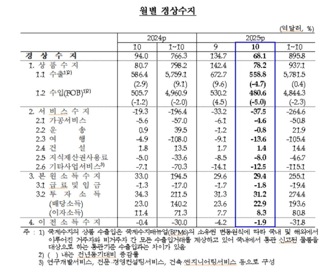 한국은행이 5일 발표한 국제수지 잠정 통계에 따르면 10월 경상수지는 68억 1천만 달러(약 10조 447억 원) 흑자로 집계됐습니다.