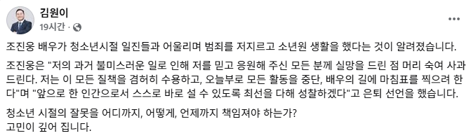 민주당 김원이 의원은 페이스북에서 조씨의 은퇴 선언을 일부 인용한 뒤 "청소년 시절의 잘못을 어디까지, 어떻게, 언제까지 책임져야 하는가"라고 했습니다.