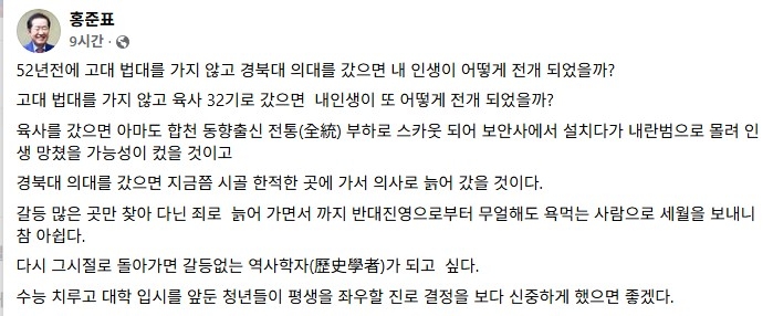 홍준표 전 시장은 8일 자신의 페이스북에 "52년 전에 고대 법대를 가지 않고 경북대 의대를 갔으면 내 인생이 어떻게 전개 됐을까? 고대 법대를 가지 않고 육사 32기로 갔으면 내 인생이 또 어떻게 전개 됐을까?"라고 적었습니다.
