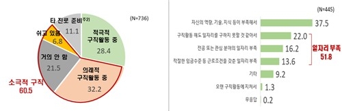 구직에 소극적인 이유를 묻자 절반 이상(51.8%)은 '일자리가 부족해서'를 들었습니다.