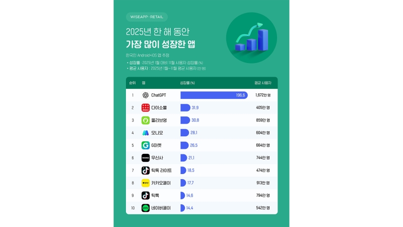 10일 실시간 앱·결제 데이터 분석 기업 와이즈앱·리테일이 한국인 스마트폰 이용자를 표본 조사한 결과 올해 1월 대비 지난달 사용자가 가장 많이 증가한 앱은 196.6% 성장률을 기록한 챗GPT로 나타났습니다.