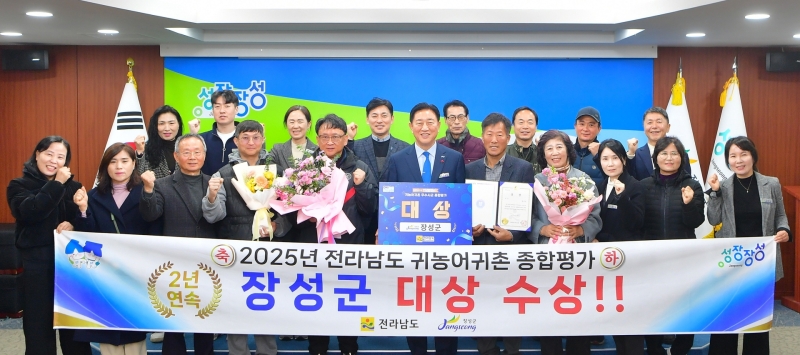전남 장성군이 전라남도 귀농어귀촌 종합평가에서 2년 연속 1위를 차지하며 '대상'을 수상했습니다.