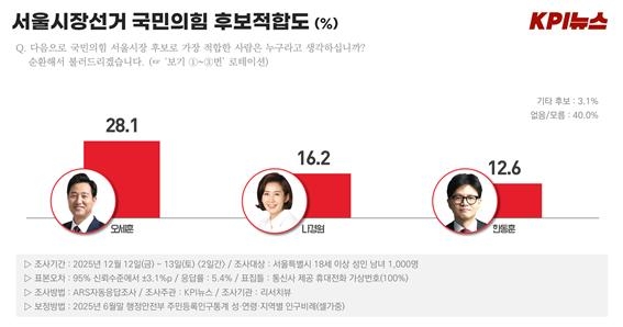 국민의힘 서울시장 적합도 조사 결과, 오세훈 현 시장이 가장 높은 지지율을 기록했습니다.
