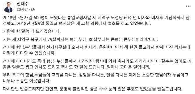 그는 자신의 지역구 주민들을 언급하며 "형님, 누님들이 교회를 다니든, 성당을 다니든, 절을 다니든 제게는 소중한 형님이자 누님이고 너무나 소중한 이웃"이라고 덧붙였습니다.