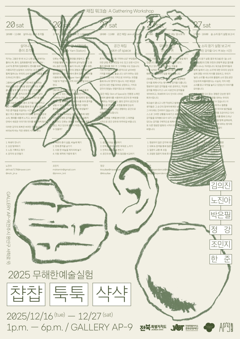 전북 지역 시각예술 프로젝트그룹 '무해한예술실험'이 오는 12월 27일까지 전주 서학동 예술마을에 위치한 GALLERY AP-9 (구 아트갤러리 전주)에서 《챱챱 툭툭 샥샥》 전을 개최하고 있습니다.