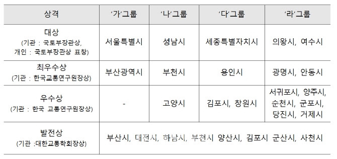 국토교통부는 이날 세종시 한국교통연구원에서 시상식을 열고 최우수 5개 지자체에는 대상인 국토부 장관상을 수여했습니다.