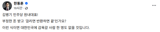 김 원내대표가 "숙박 비용을 즉시 반환하겠다"고 밝히자 한 전 대표는 자신의 페이스북을 통해 "김병기 민주당 원내대표! 부정한 돈 받고 걸리면 반환하면 끝인가요? 이런 식이면 대한민국에 감옥 갈 사람 한 명도 없을 것"이라고 밝혔습니다.