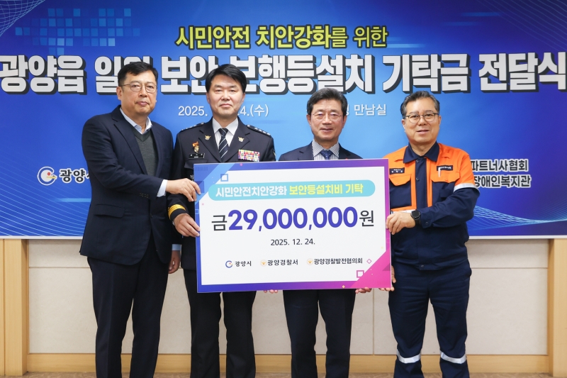 포스코광양제철소, 광양경찰발전협의회, 광양제철소파트너사협회는 지난 24일, 광양시청에서 보안·보행등 설치를 위한 지원금 5천만 원을 광양시에 전달했다고 밝혔습니다.
