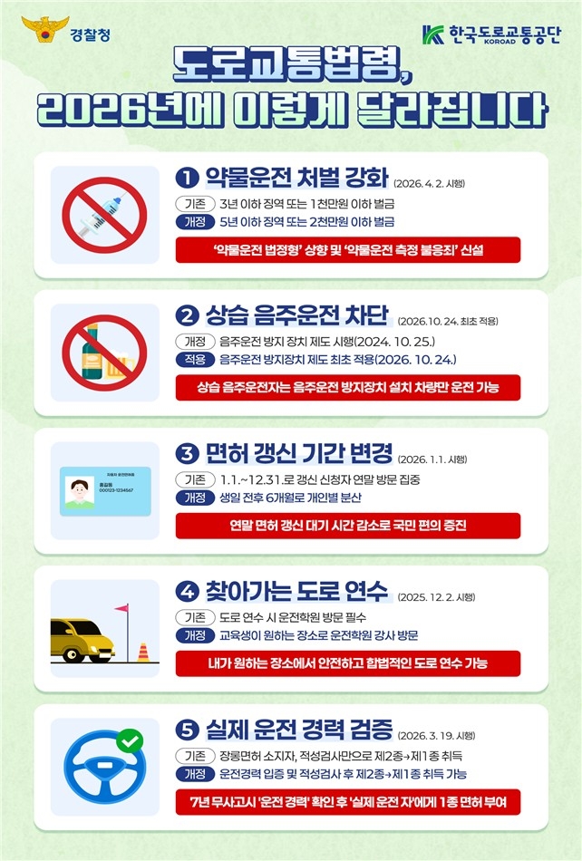 28일 경찰청이 공개한 '2026년 달라지는 도로교통법령'에 따르면 최근 5년 안에 2차례 이상 음주운전을 한 사람은 결격 기간 2년이 지난 뒤 면허를 재취득할 경우 음주운전 방지 장치를 차량에 부착해야 합니다.