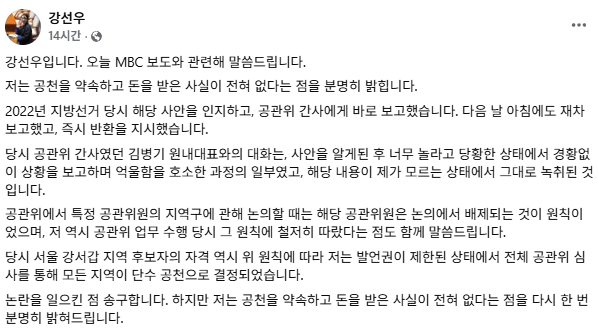 이에 대해 강 의원은 페이스북 글에서 "저는 공천을 약속하고 돈을 받은 사실이 전혀 없다는 점을 분명히 밝힌다"고 강조했습니다.