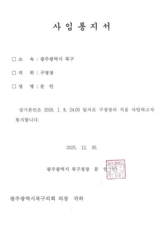 광주 북구에 따르면 문인 구청장은 30일 북구의회에 사임 통지서를 제출했습니다.